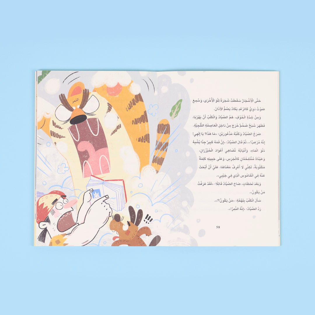 في قديم الزمان، كان هناك صياد يعيش في أعالي الجبال، ويصطاد مع كلبه السريع بمهارة فائقة تخيف حيوانات الغابة. فكر الصياد ذات يوم بحيلة تخفف عنه مشقة الصيد، فطلب من الحيوانات أن تأتيه كل يوم بفريسة، فوافقت وقدمت له عددا لا حصر له من الأرانب ليأكلها، وثيابا للتدفئة مصنوعة من جلد الفهد، وحذاء لامعا من جلد البقر، وقبعة أنيقة من جلد الثعلب، لكن عندما طلب جلد النمر الملك ليصنع منه وسادة رفضت، فأحضر الصياد بندقية، واستعد لأخذ ما يريده بالقوة.